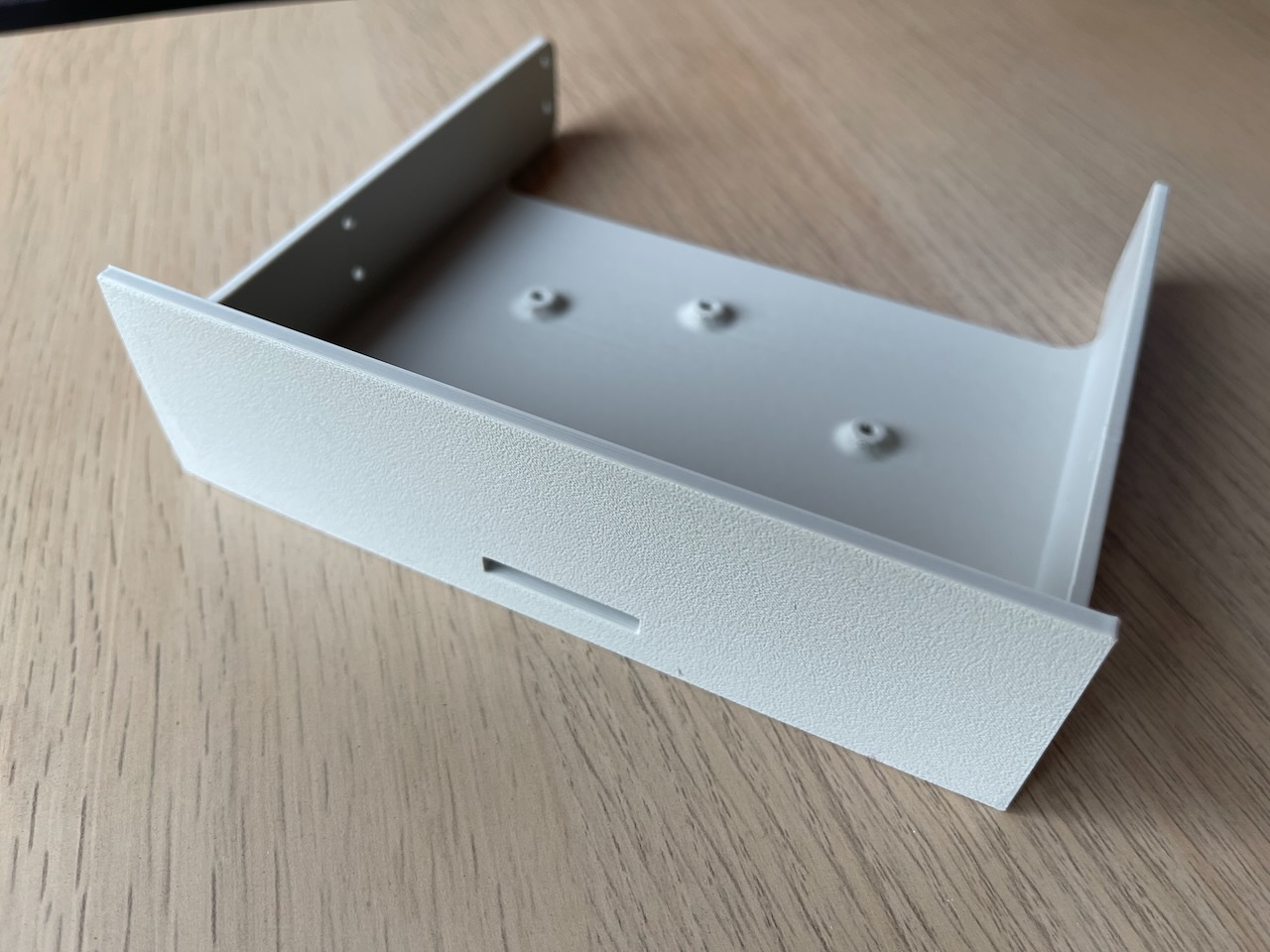 - The front of the tray is lightly textured to match the grain usually found on 5.25″ floppy drives.